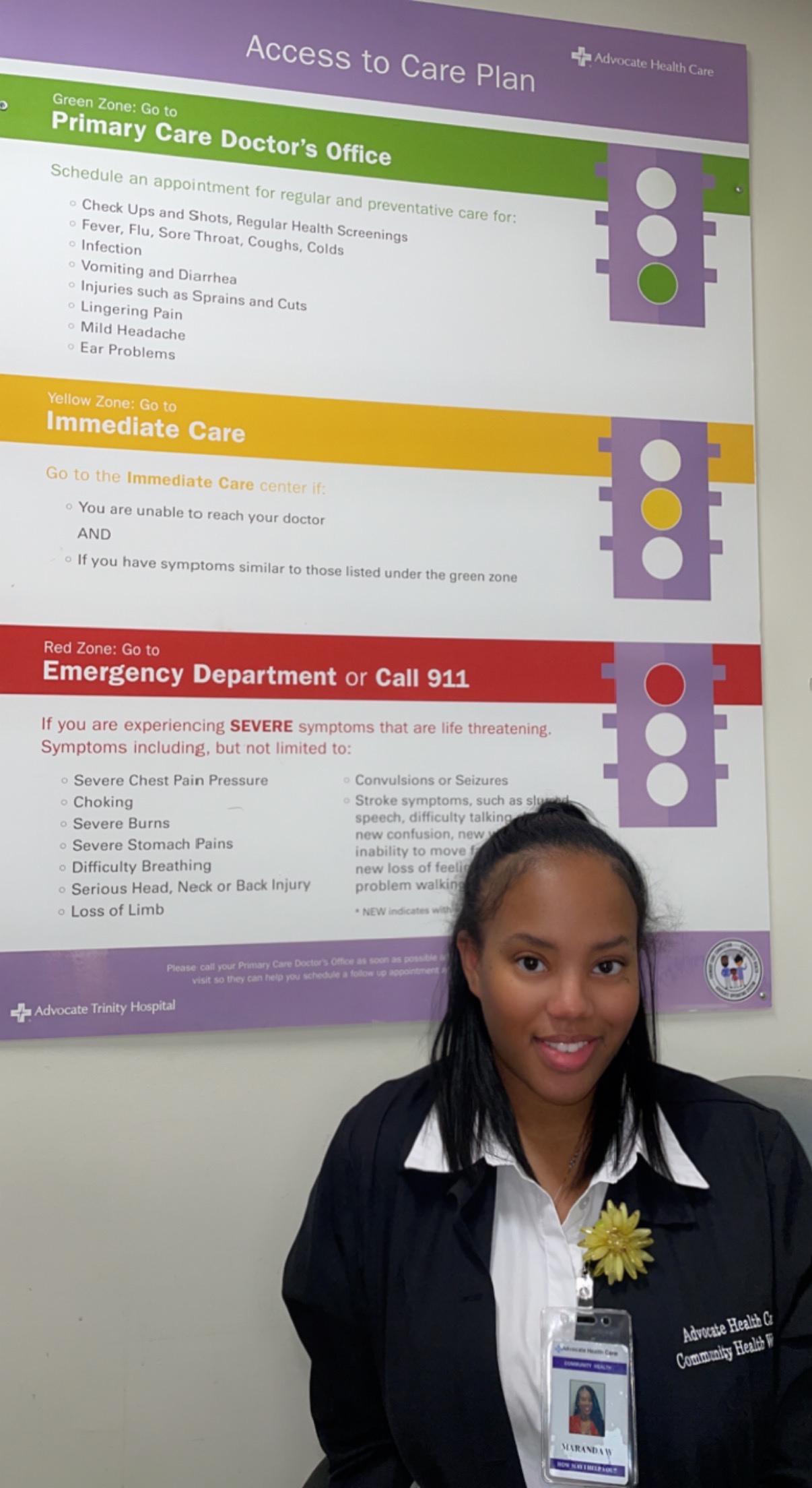 A: Absolutely! We provide the patients with resources such as housing, transportation, food, and financial stability that they may need. We also establish primary care for patients that come in and schedule appointments, whether it be with a primary care physician or a follow-up with a specialty provider. We educate patients on how to properly use the emergency room. For example, we provide them with our access to care plan, which has 3 zones (green, yellow, and red). Each zone specifies when the patient should report to their primary care doctor, immediate care (urgent care), or the emergency room.