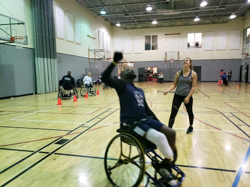 Personally, my favorite activity is Wheelchair Basketball practice. The Ballers are made up of different ages and abilities, something that allows them to be competitive at every tournament they attend. From the 15-year old who sinks 3-pointers with ease and maneuvers his chair more gracefully than I thought possible, to the athlete who has been playing since long before I was born and offers guidance and wisdom to the rest of the team, they each bring a different strength to the game. Their practice is formatted like any other basketball practice, with a mix of conditioning, shooting and passing drills,running plays, and scrimmaging. Conditioning consists of sprints up and down the floor, sometimes with a teammate or two holding onto their chair from behind for some added weight. As a volunteer, I help out mostly with the shooting drills, catching rebounds and grabbing stray balls so the athletes can spend more time practicing and less time chasing after a missed shot. Each player is incredibly grateful, even when I throw a pass out of their reach or at their feet.